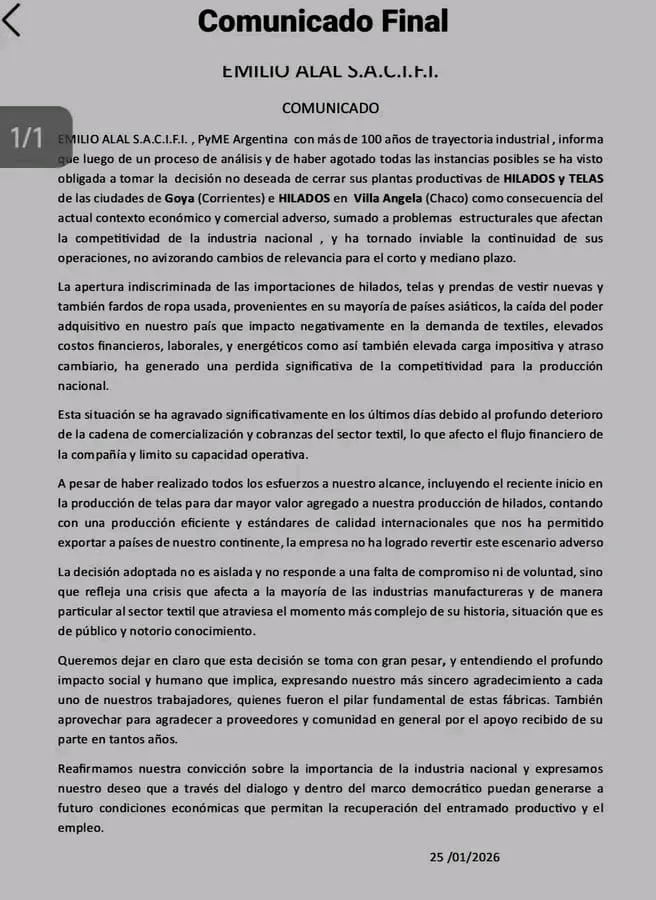 La histórica PyME textil Emilio Alal anunció el cierre definitivo de su planta en Goya y de otra en nuestra provincia del Chaco,la planta ubicada en Villa Ángela a raíz de la crisis que atraviesa el sector. La medida deja sin empleo a 260 trabajadores y a personal tercerizado, y fue atribuida al contexto económico adverso y a la pérdida de competitividad de la industria nacional.